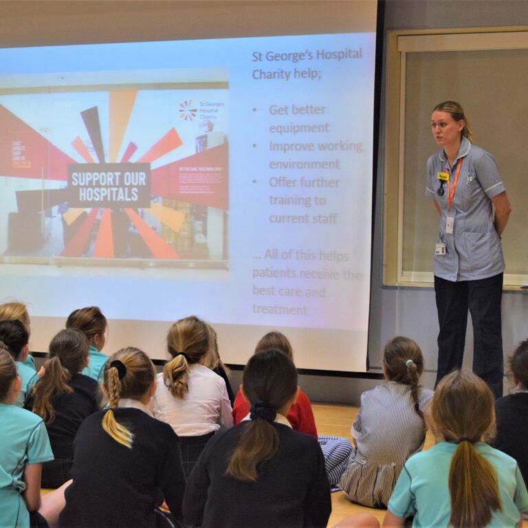 Staff Nurse Nicole Sproul joined us at Broomwood Girls today to thank the school for raising over £50,000 for St George’s Hospital appeals. Over this last year children and parents have held fundraising events to support the work with patients and staff across all departments. Nicole, who had joined us straight from completing a night shift, told the children about her work and about the 8000 staff required to keep the hospital running.